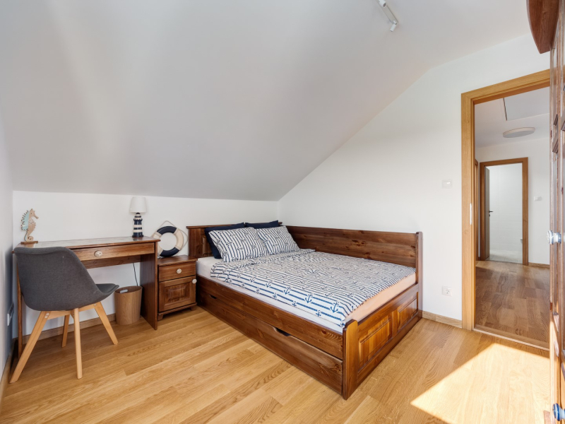 Az emeleten három hálószoba és két fürdőszoba van.