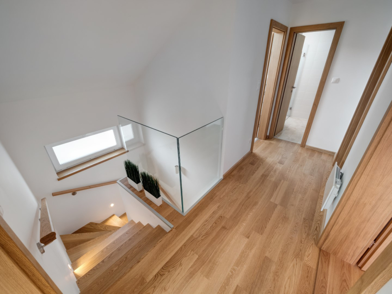 - üveg zuhanykabin - emelő-toló teraszajtók - lépcső alatt kamra kerül kialakításra - tölgyfa lépcsőburkolat