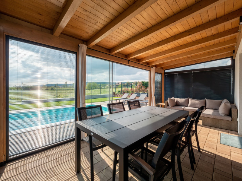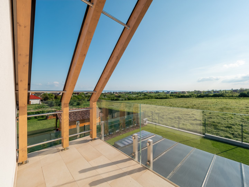 - minőségi szaniterek, Wellis kád, Grohe csaptelepek - 21 m2-es télikert, alumínium keretes biztonsági üveggel, keret nélküli lapozható üveg tolóajtóval