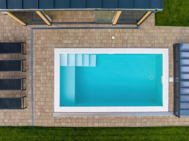 - H tarifás villanyóra - 6x3 m- es vasbeton szerkezetű, hőszivattyúval fűtött medence napozórésszel. (gépházzal, automatizált gépészettel)