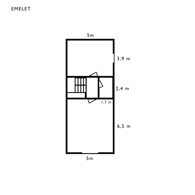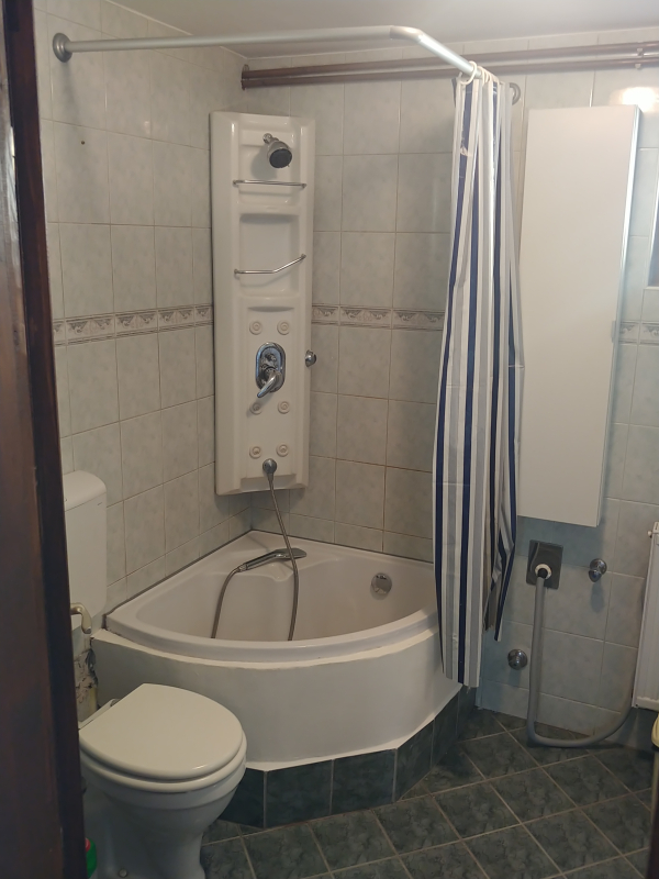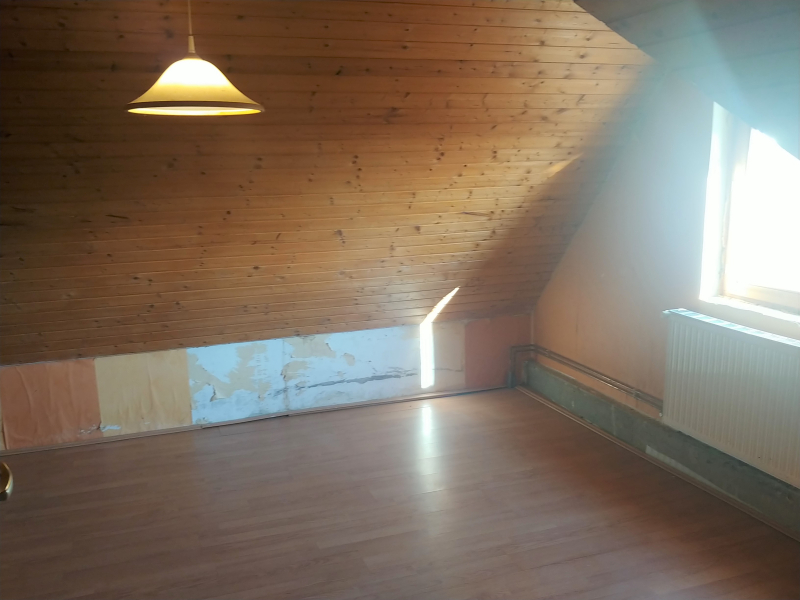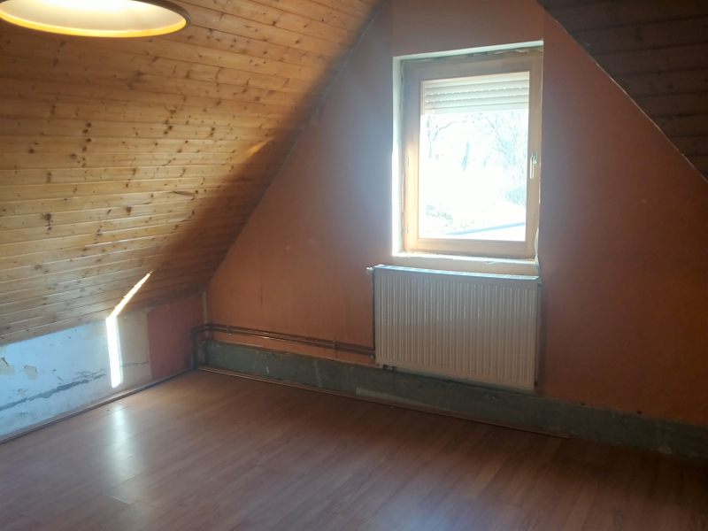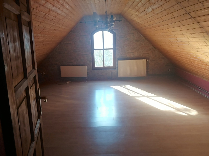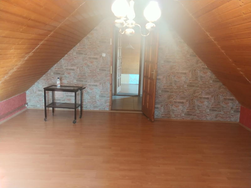 A tetőtérben két nagy méretű hálószoba található (20 illetve 33 m2-es) és egy fürdőszoba, melynek kialakítása az új tulajdonosra vár.