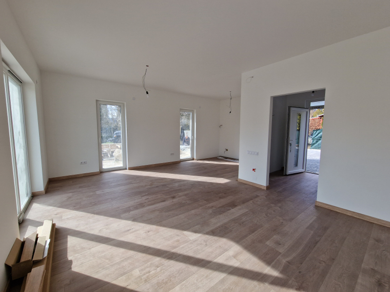 A földszinten 43 m2-es, dél-keleti tájolású amerikai konyhás nappali+étkező, előtér, fürdő, különálló WC (és opcionálisan egy szoba) kap helyet. A nappalihoz egy 42,4 m2-es L alakú terasz kapcsolódik.