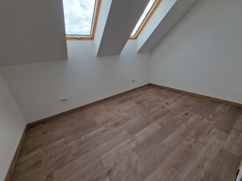 Az emeleten fürdő és külön WC, egy nappali valamint 2 hálószoba és egy erkély kerül kialakításra. A tetőtérben 58,22 m2 az 1,9 m feletti belmagasságú terület.