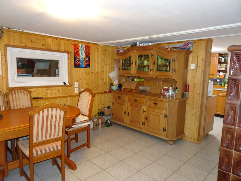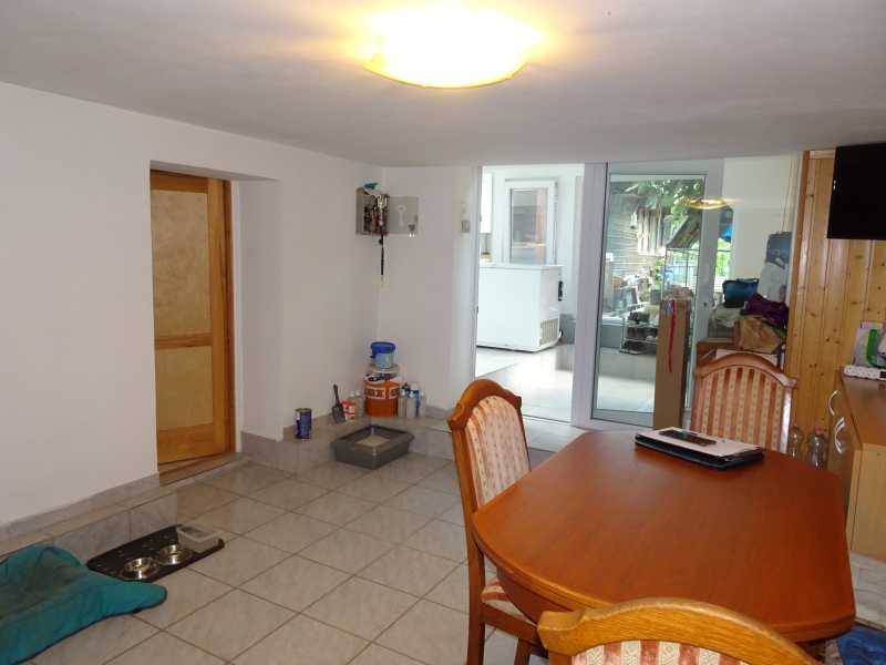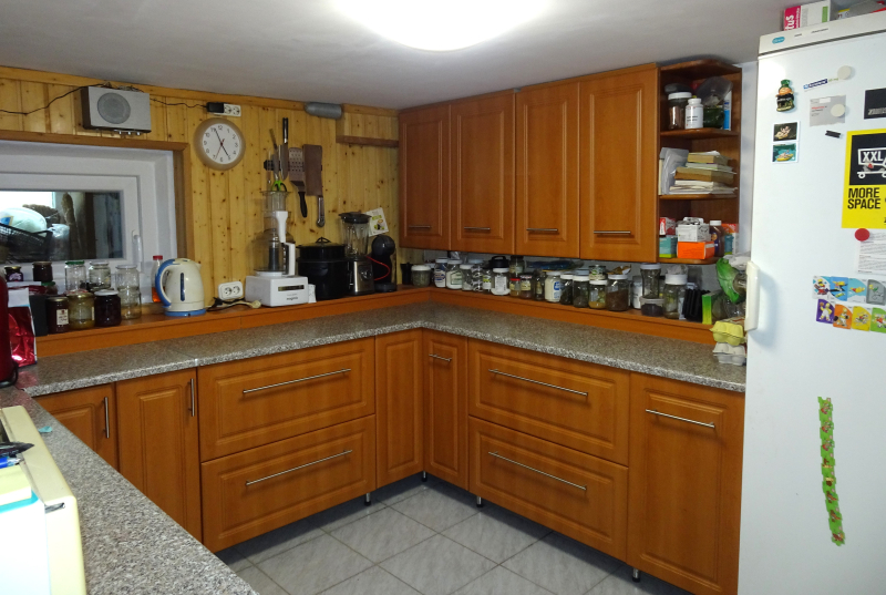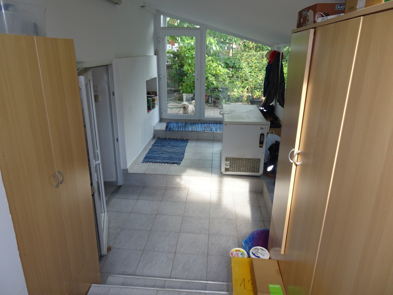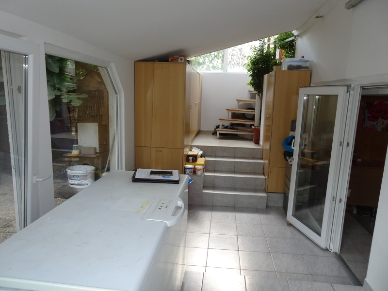 - az alsó, szuterén szinten: konyha, étkező, kamra és egy gépészeti- és háztartási helyiség (WC-vel), valamint egy külön bejáratú tároló