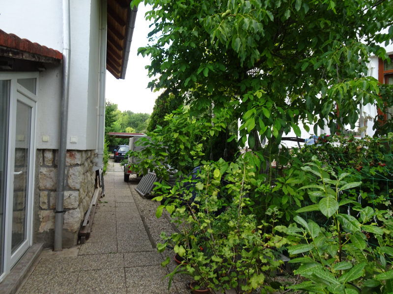 A 664 m2-es (15 m utcafronti szélességű) összközműves telek rendezett. Gyümölcsfákkal, dísznövényekkel telepített, egy 5 m2-es kerti tó és egy szerszámos tároló is található itt.