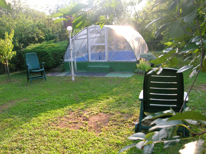 A személyautók elhelyezésére két garázs is rendelkezésre áll. A kertben több helyen is elhelyeztek fedett kiülő- és sütögető helyet, szerszámtárolót, valamit egy 80 cm mély, 3 X 4 m-es fedett kismedence is a kikapcsolódást szolgálja.