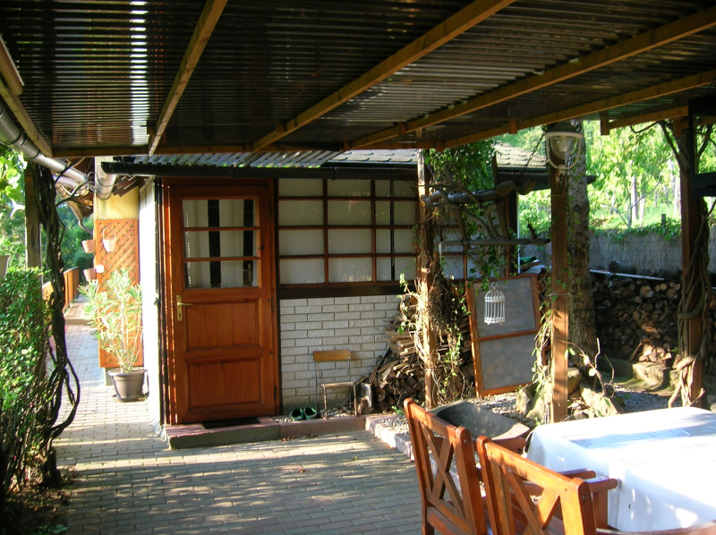 Ezen az oldalon egy kb. 22 m2-es, könnyűszerkezetes kisház is áll, amely fedett terasszal össze lett kötve a főépülettel. Jelenleg nyári konyha, de választható funkciójú, pl. egy szaunás, zuhanyzós wellnes sarok is kialakítható benne.
