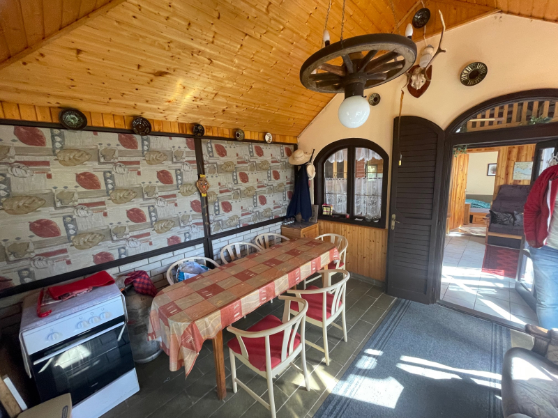 Bal oldali, könnyűszerkezetes lakrész: nappali, amely felett galériázott háló lett kialakítva, zuhanyzós fürdőszoba + WC, konyha, hálószoba, tágas előtér. Fűtése: klíma és lemezkandalló