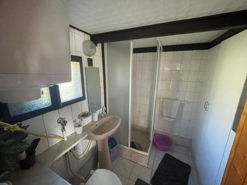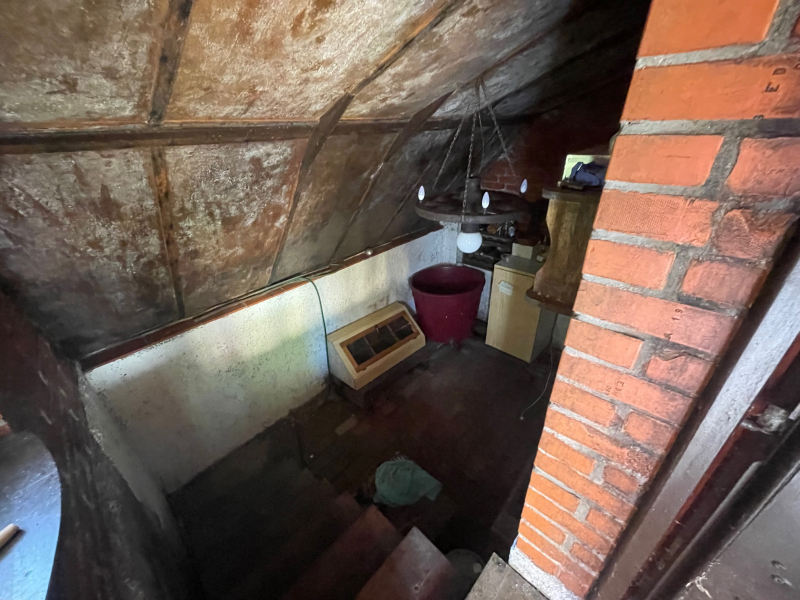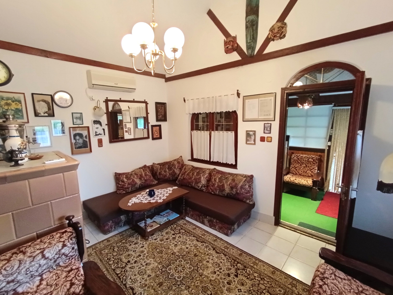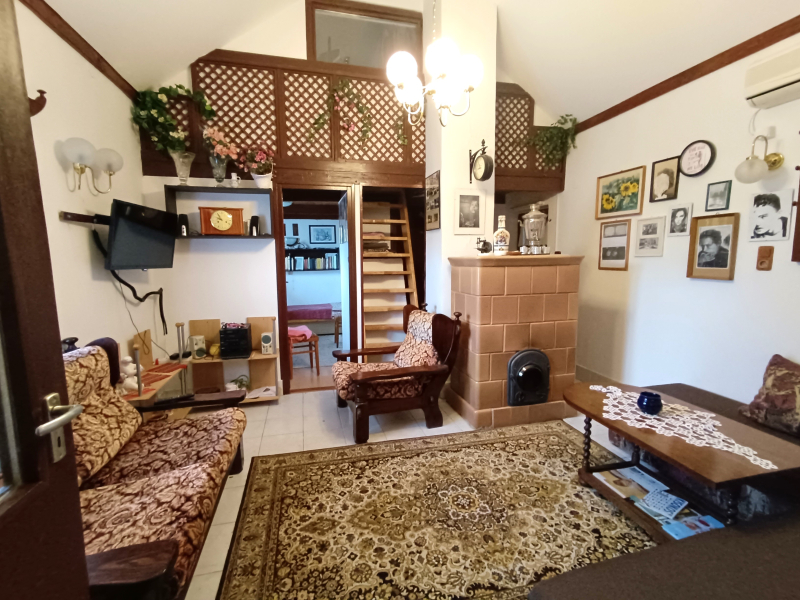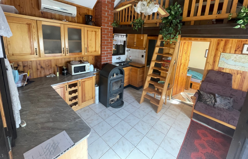 Jobb oldali, téglaépítésű lakrész: nappali, galériázott háló, zuhanyzós fürdőszoba + WC, tágas előtér, hálószoba. Fűtése: klíma és cserépkályha